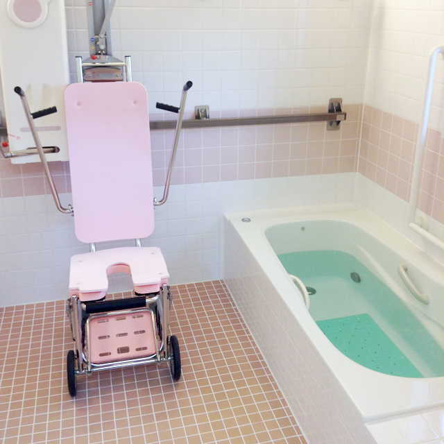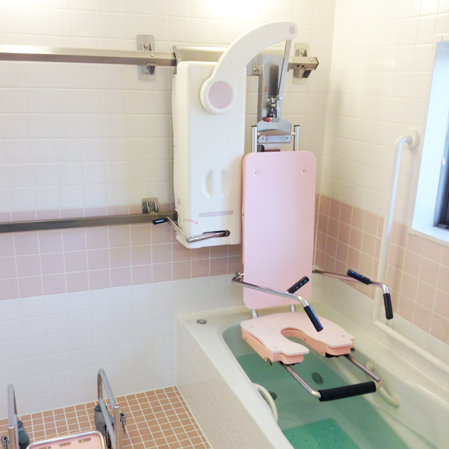 大きめなお風呂場で入浴リフトも完備していますので、安心して安全に入浴できます。また、足のむくみなどある方で希望の方にはオイルマッサージも行っております。